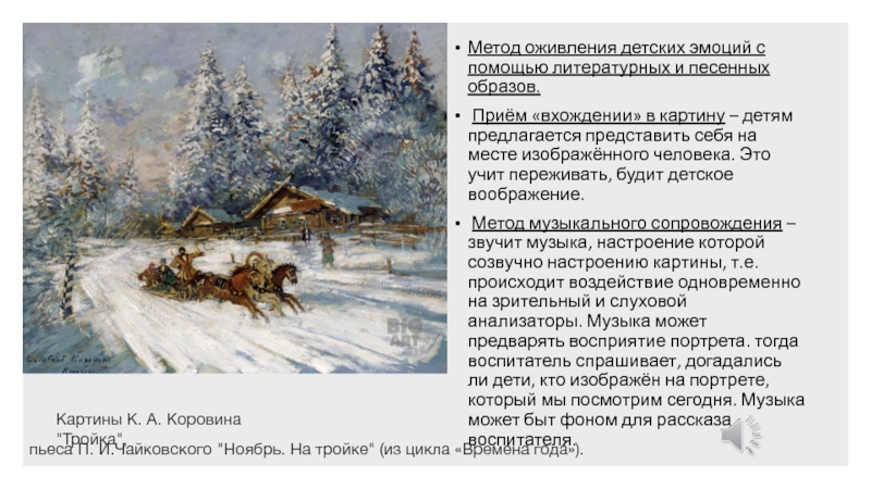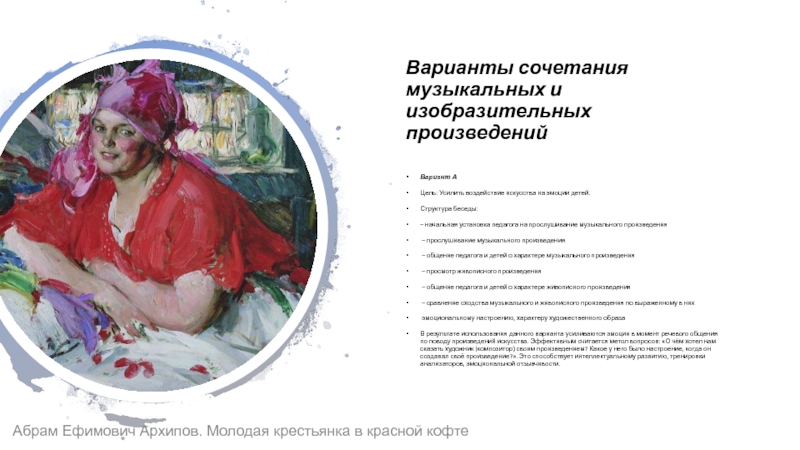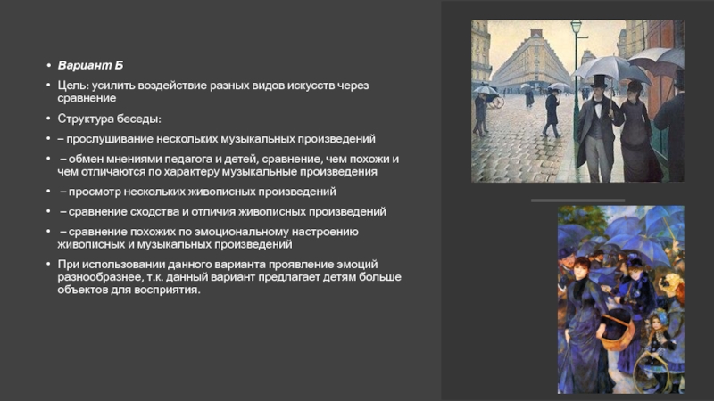 В результате использования данного варианта усиливаются эмоции в момент речевого общения по поводу произведений искусства. Эффективным считается метол вопросов: «О чём хотел нам сказать художник (композитор) своим произведением? Какое у него было настроение, когда он создавал своё произведение?». Это способствует интеллектуальному развитию, тренировки анализаторов, эмоциональной отзывчивости.