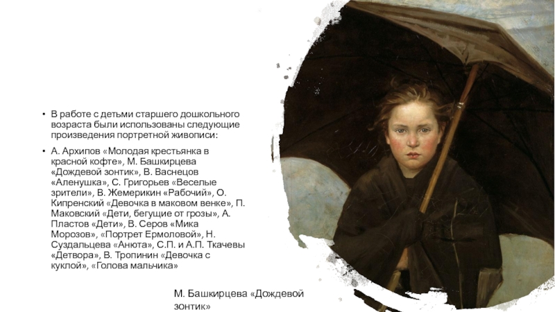 М. Башкирцева «Дождевой зонтик», В. Васнецов «Аленушка», С. Григорьев «Веселые зрители», В. Жемерикин «Рабочий», О. Кипренский «Девочка в маковом венке», П. Маковский «Дети, бегущие от грозы», А. Пластов «Дети», В. Серов «Мика Морозов», «Портрет Ермоловой», Н. Суздальцева «Анюта», С.П. и А.П. Ткачевы «Детвора», В. Тропинин «Девочка с куклой», «Голова мальчика»