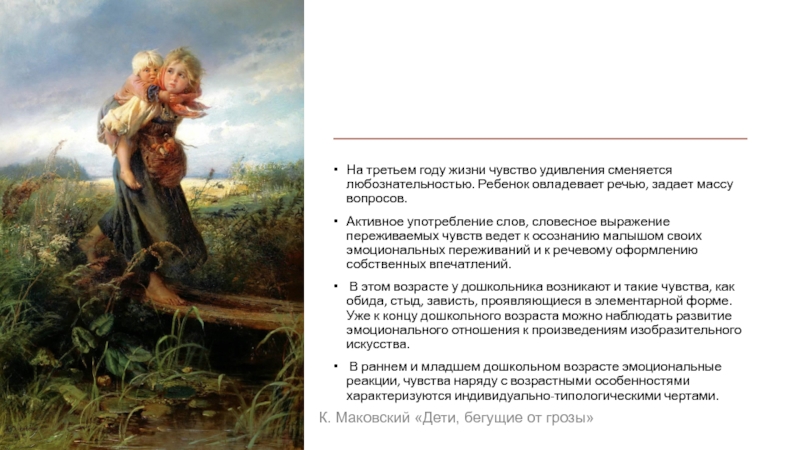 В этом возрасте у дошкольника возникают и такие чувства, как обида, стыд, зависть, проявляющиеся в элементарной форме. Уже к концу дошкольного возраста можно наблюдать развитие эмоционального отношения к произведениям изобразительного искусства.