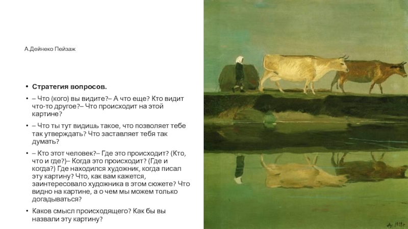 – Кто этот человек?– Где это происходит? (Кто, что и где?)– Когда это происходит? (Где и когда?) Где находился художник, когда писал эту картину? Что, как вам кажется, заинтересовало художника в этом сюжете? Что видно на картине, а о чем мы можем только догадываться?