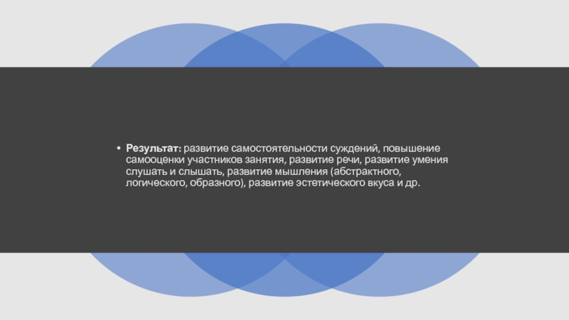 Слайд 55Результат: развитие самостоятельности суждений, повышение самооценки участников занятия, развитие речи,