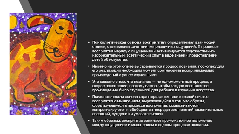 В результате у ребенка возникает художественно-изобразительный образ. Восприятие, представляющее собой некую совокупность различных ощущений, не сводится к простой сумме этих ощущений.