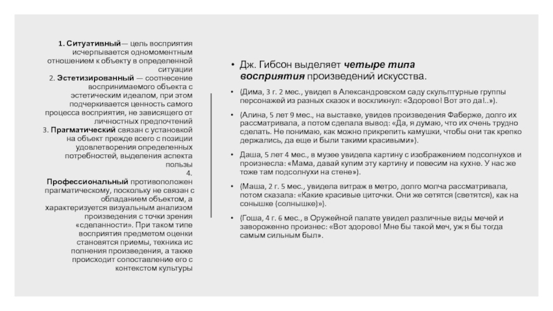 Дж. Гибсон выделяет четыре типа восприятия произведений искусства.