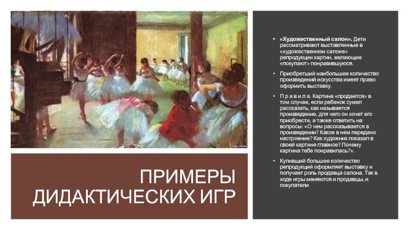 П р а в и л а. Картина «продается» в том случае, если ребенок сумел рассказать, как называется произведение, для чего он хочет его приобрести, а также ответить на вопросы: «О чем рассказывается в произведении? Какое в нем передано настроение? Как художник показал в своей картине главное? Почему картина тебе понравилась?».