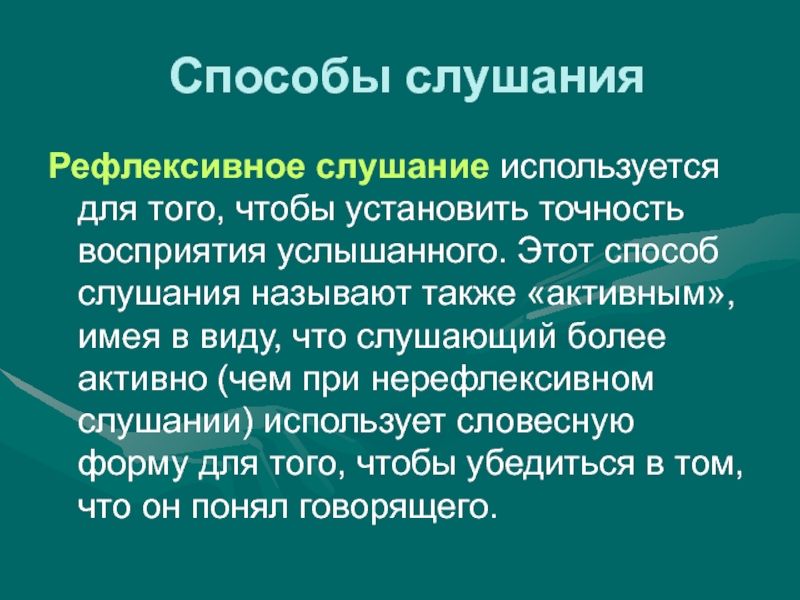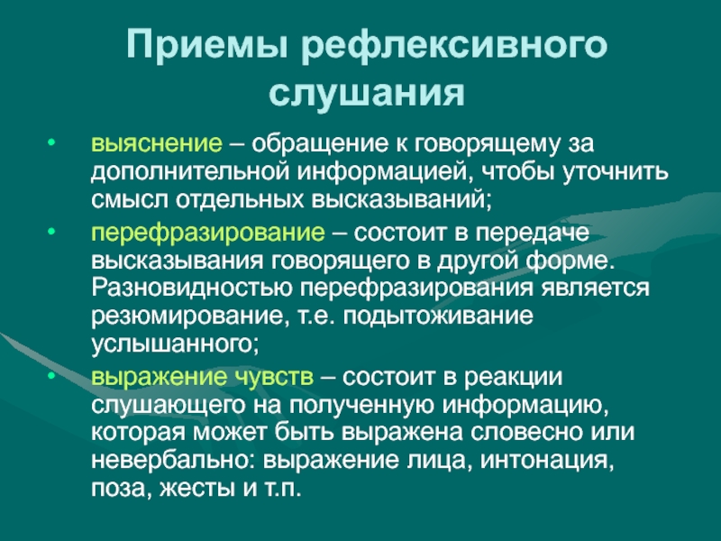 что слушающий более активно (чем при нерефлексивном слушании) использует словесную форму для того, чтобы убедиться в том, что он понял говорящего.