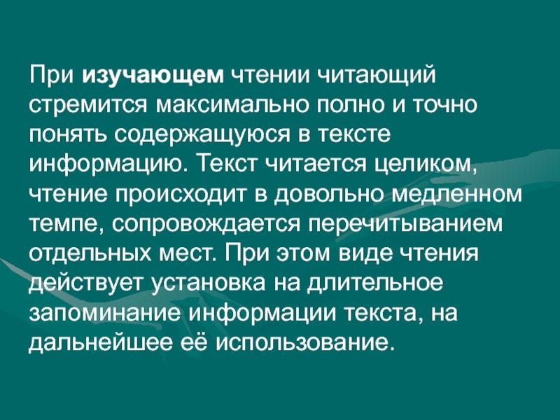 Слайд 14При изучающем чтении читающий стремится максимально полно и точно понять