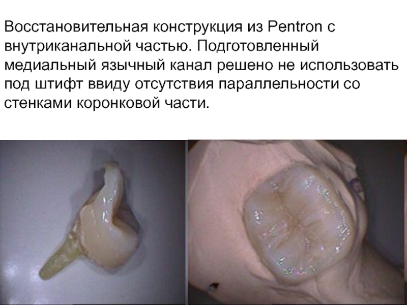 Слайд 5Восстановительная конструкция из Pentron c внутриканальной частью. Подготовленный медиальный язычный