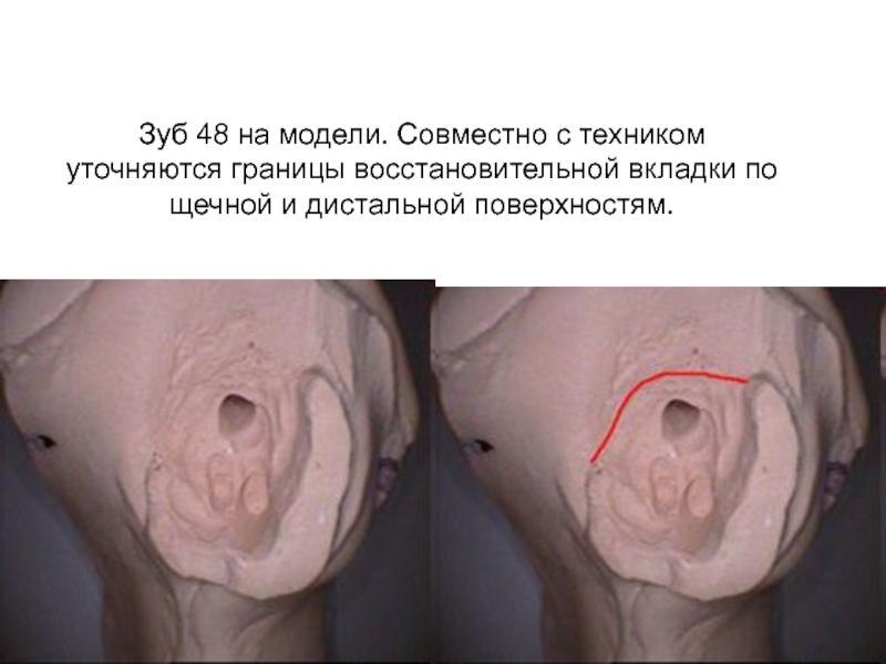 Слайд 3Зуб 48 на модели. Совместно с техником уточняются границы восстановительной