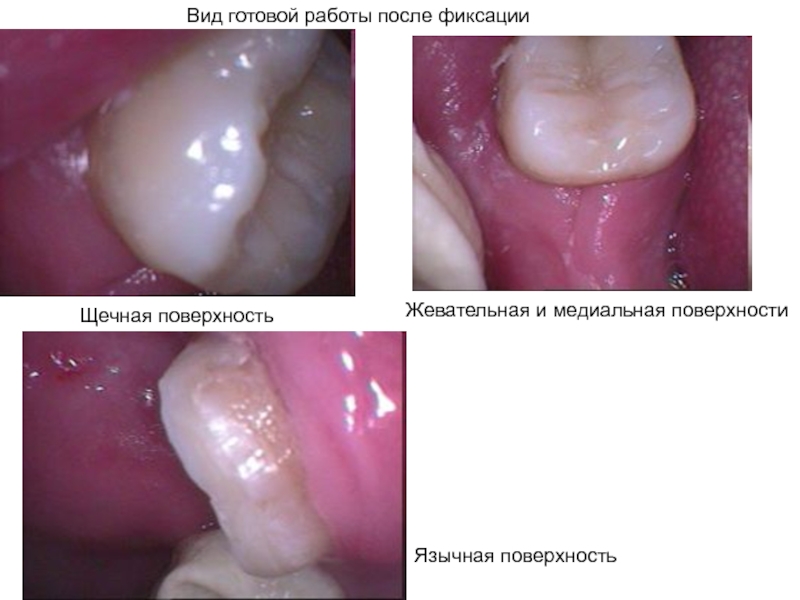 Вид готовой работы после фиксацииЩечная поверхностьЖевательная и медиальная поверхностиЯзычная поверхность