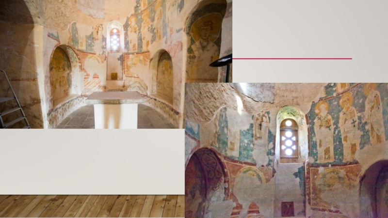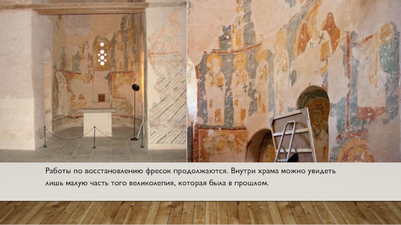Слайд 11Работы по восстановлению фресок продолжаются. Внутри храма можно увидеть лишь
