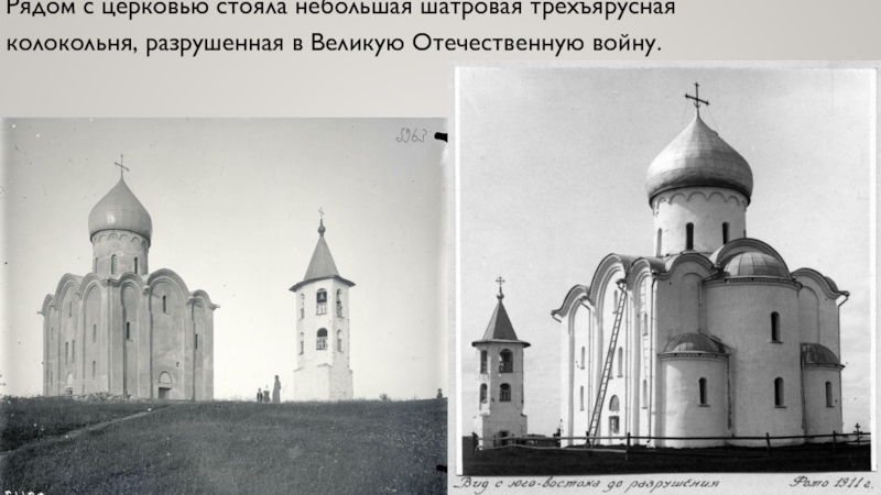 Слайд 8Рядом с церковью стояла небольшая шатровая трехъярусная колокольня, разрушенная в