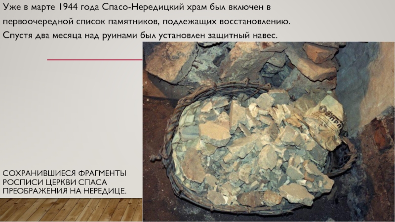 Сохранившиеся фрагменты росписи церкви Спаса Преображения на Нередице.Уже в марте 1944 года Спасо-Нередицкий храм был включен в