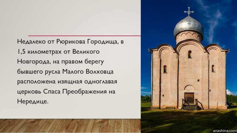 Недалеко от Рюрикова Городища, в 1,5 километрах от Великого Новгорода, на правом берегу бывшего русла Малого Волховца расположена изящная одноглавая церковь Спаса Преображения на Нередице.