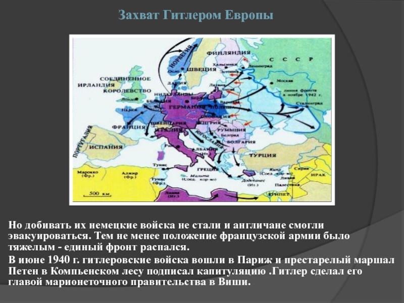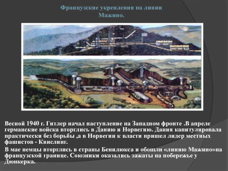 Норвегию. Дания капитулировала практически без борьбы ,а в Норвегии к власти пришел лидер местных фашистов - Квислинг.В мае немцы вторглись в страны Бенилюкса и обошли «линию Мажино»на французской границе. Союзники оказались зажаты на побережье у Дюнкерка.