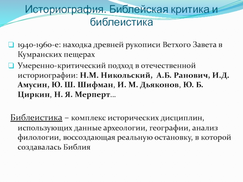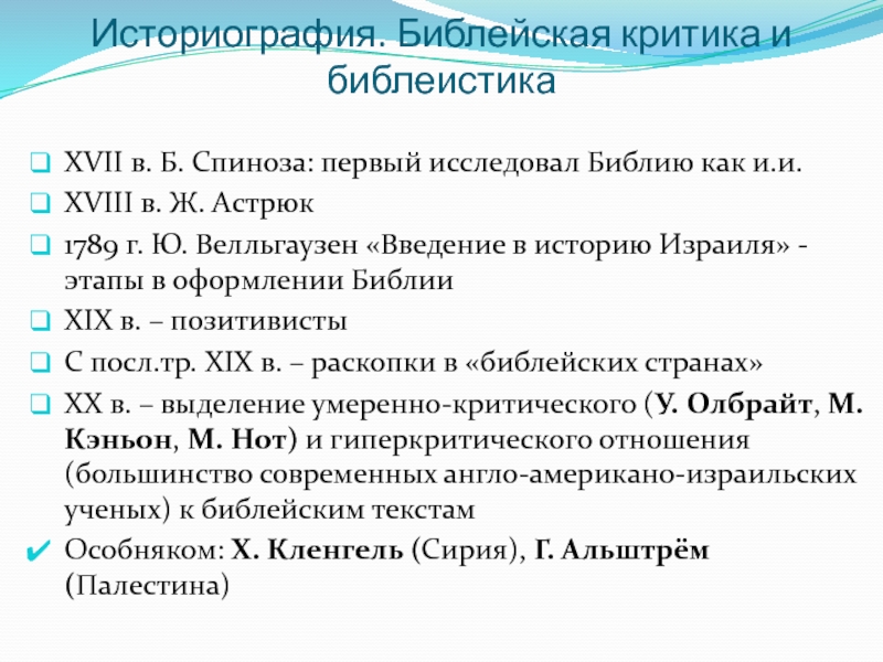 XX в. – выделение умеренно-критического (У. Олбрайт, М. Кэньон, М. Нот) и гиперкритического отношения (большинство современных англо-американо-израильских ученых) к библейским текстам