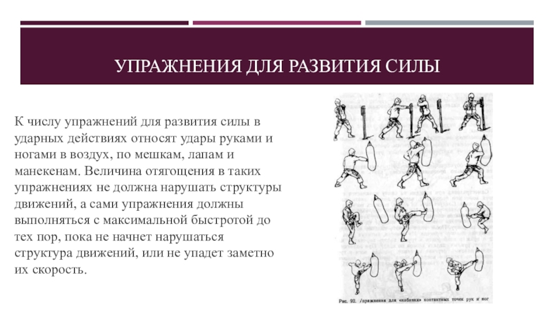 с максимальным ускорением в финальной части, рывки и толчки штанги, а также преодоление инерции собственного тела при ударах, защитах, при переходах от защит к ударам и наоборот. Эффективным и наиболее применяемым упражнением для развития силы мышц-разгибателей рук, которые несут основную нагрузку в ударных действиях, являются различные отжимания в упоре лежа. Кроме того, для атлетической подготовки широко применяются также упражнения на перекладине, брусьях, гимнастической стенке, с амортизаторами и отягощениями, с партнерами.