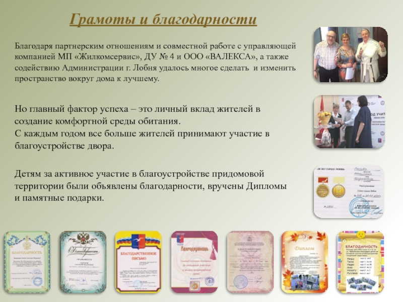 Благодаря партнерским отношениям и совместной работе с управляющей компанией МП «Жилкомсервис», ДУ № 4 и ООО «ВАЛЕКСА», а также содействию Администрации г. Лобня удалось многое сделать и изменить пространство вокруг дома к лучшему.
