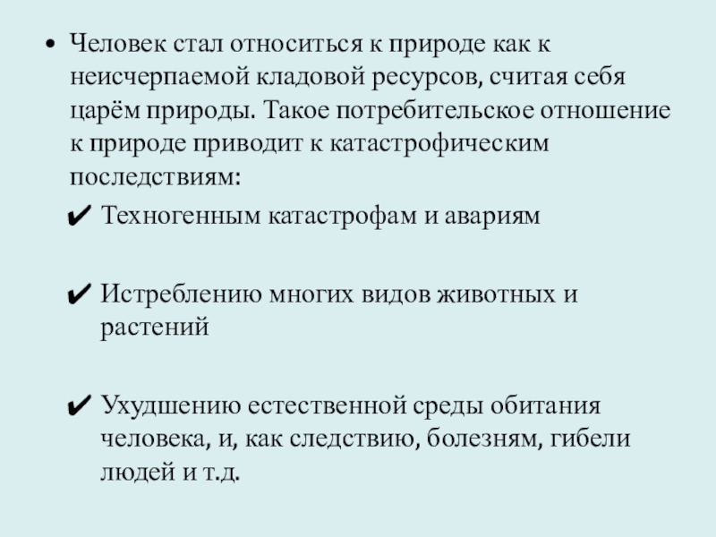 Слайд 5Человек стал относиться к природе как к неисчерпаемой кладовой ресурсов,