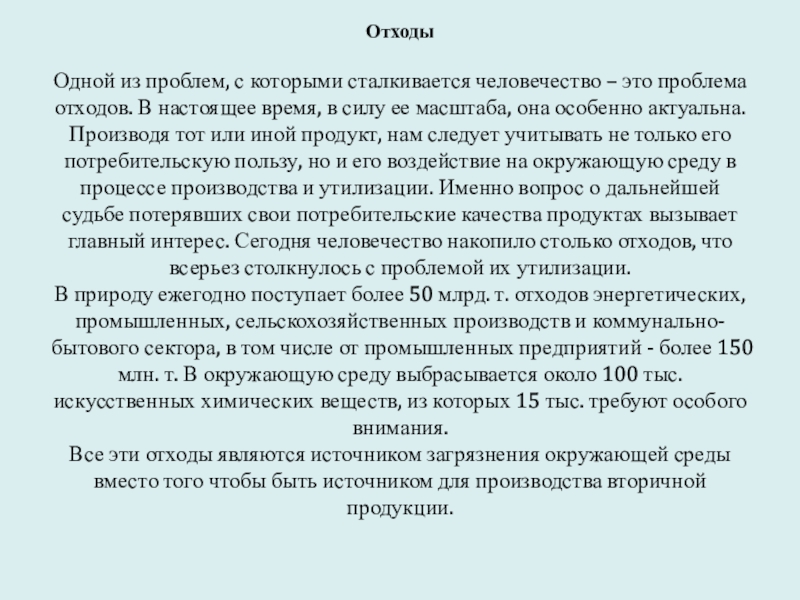 Все эти отходы являются источником загрязнения окружающей среды вместо того чтобы быть источником для производства вторичной продукции.