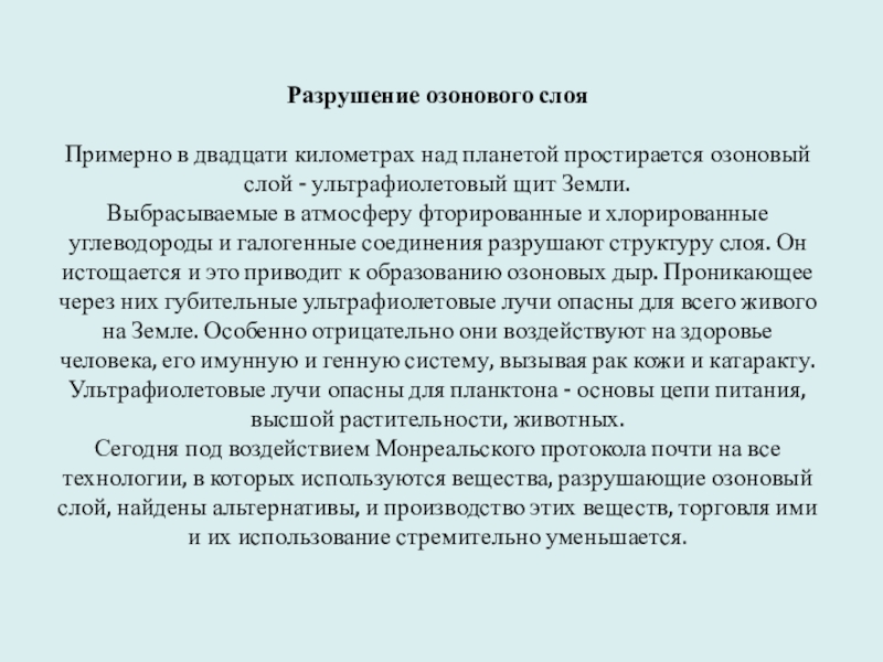 углеводороды и галогенные соединения разрушают структуру слоя. Он истощается и это приводит к образованию озоновых дыр. Проникающее через них губительные ультрафиолетовые лучи опасны для всего живого на Земле. Особенно отрицательно они воздействуют на здоровье человека, его имунную и генную систему, вызывая рак кожи и катаракту. Ультрафиолетовые лучи опасны для планктона - основы цепи питания, высшой растительности, животных.