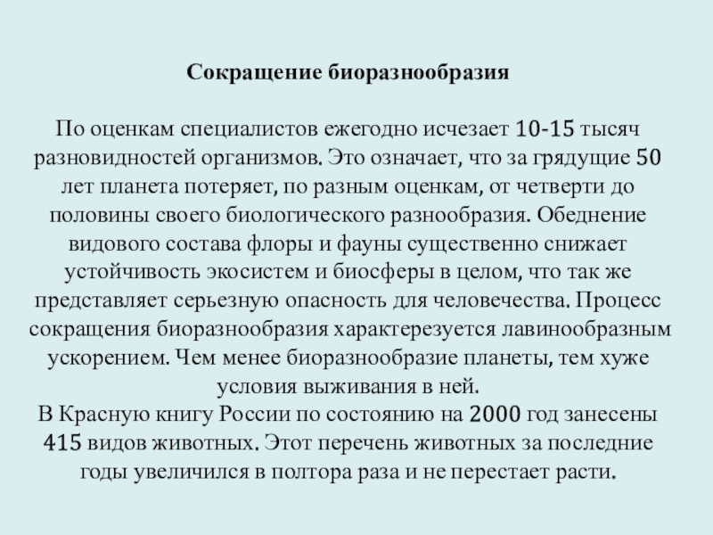 разным оценкам, от четверти до половины своего биологического разнообразия. Обеднение видового состава флоры и фауны существенно снижает устойчивость экосистем и биосферы в целом, что так же представляет серьезную опасность для человечества. Процесс сокращения биоразнообразия характерезуется лавинообразным ускорением. Чем менее биоразнообразие планеты, тем хуже условия выживания в ней.