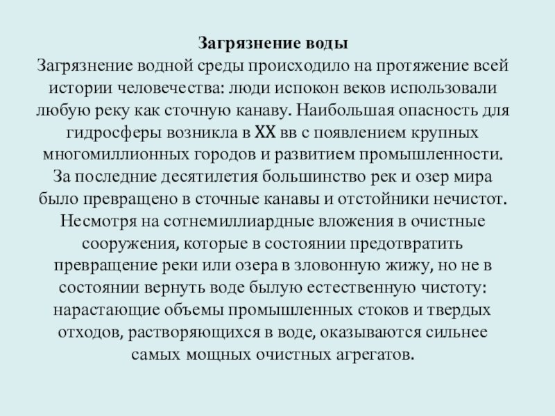 опасность для гидросферы возникла в XX вв с появлением крупных многомиллионных городов и развитием промышленности. За последние десятилетия большинство рек и озер мира было превращено в сточные канавы и отстойники нечистот. Несмотря на сотнемиллиардные вложения в очистные сооружения, которые в состоянии предотвратить превращение реки или озера в зловонную жижу, но не в состоянии вернуть воде былую естественную чистоту: нарастающие объемы промышленных стоков и твердых отходов, растворяющихся в воде, оказываются сильнее самых мощных очистных агрегатов.