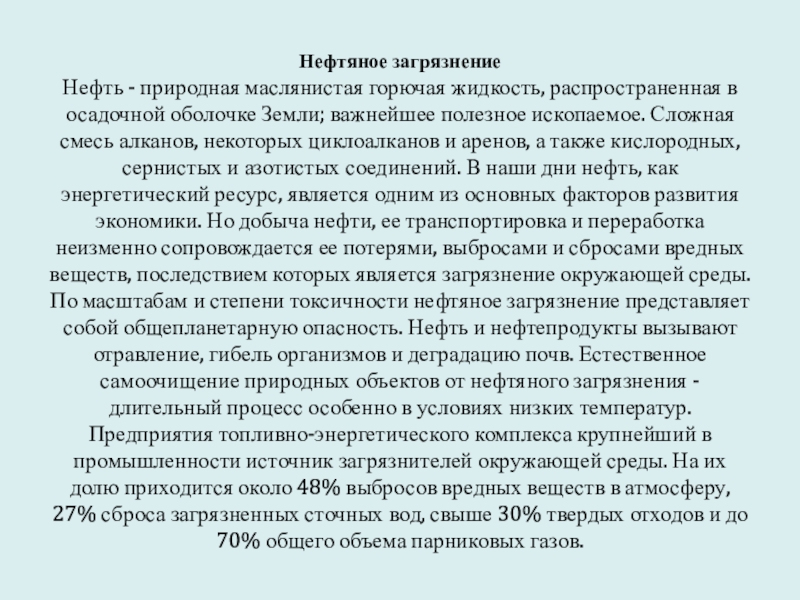 и аренов, а также кислородных, сернистых и азотистых соединений. В наши дни нефть, как энергетический ресурс, является одним из основных факторов развития экономики. Но добыча нефти, ее транспортировка и переработка неизменно сопровождается ее потерями, выбросами и сбросами вредных веществ, последствием которых является загрязнение окружающей среды. По масштабам и степени токсичности нефтяное загрязнение представляет собой общепланетарную опасность. Нефть и нефтепродукты вызывают отравление, гибель организмов и деградацию почв. Естественное самоочищение природных объектов от нефтяного загрязнения - длительный процесс особенно в условиях низких температур. Предприятия топливно-энергетического комплекса крупнейший в промышленности источник загрязнителей окружающей среды. На их долю приходится около 48% выбросов вредных веществ в атмосферу, 27% сброса загрязненных сточных вод, свыше 30% твердых отходов и до 70% общего объема парниковых газов.