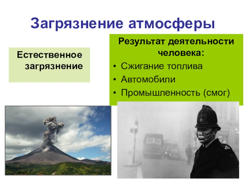 Загрязнение атмосферыЕстественное загрязнениеРезультат деятельности человека:Сжигание топливаАвтомобилиПромышленность (смог)