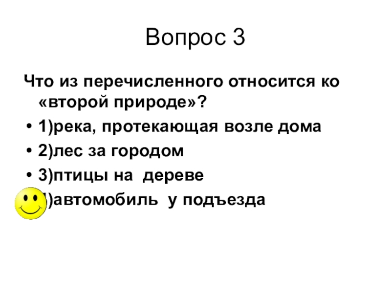 Вопрос 3Что из перечисленного относится ко «второй природе»?1)река, протекающая возле дома2)лес за городом3)птицы на дереве4)автомобиль у подъезда