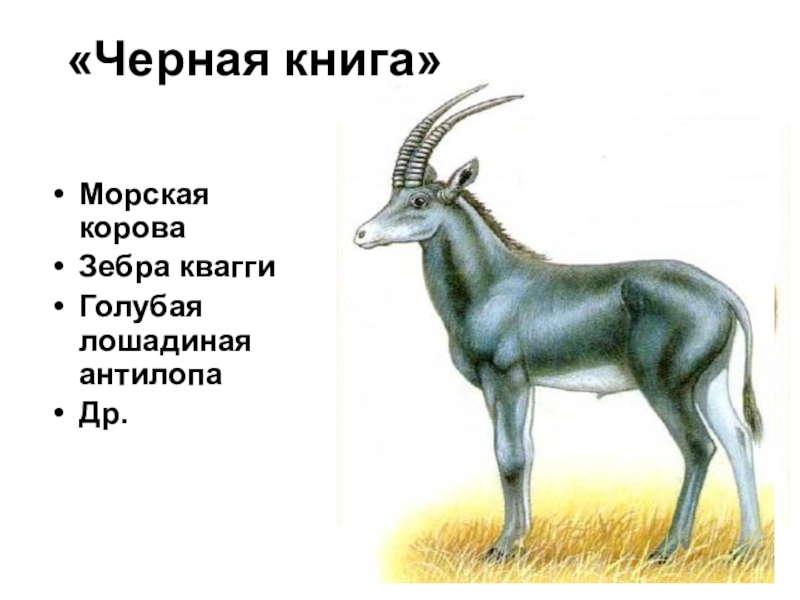 «Черная книга»Морская короваЗебра кваггиГолубая лошадиная антилопаДр.