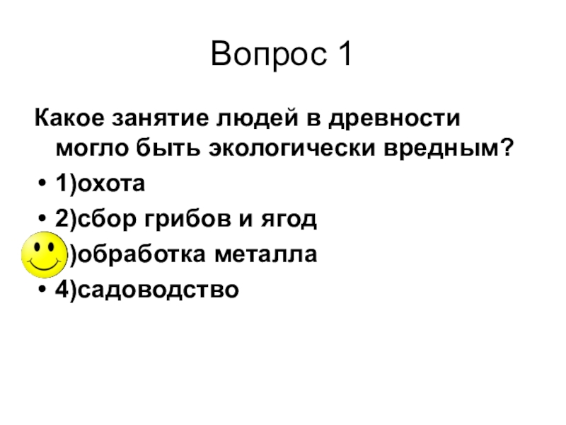 Вопрос 1Какое занятие людей в древности могло быть экологически вредным?1)охота  2)сбор грибов и ягод 3)обработка металла