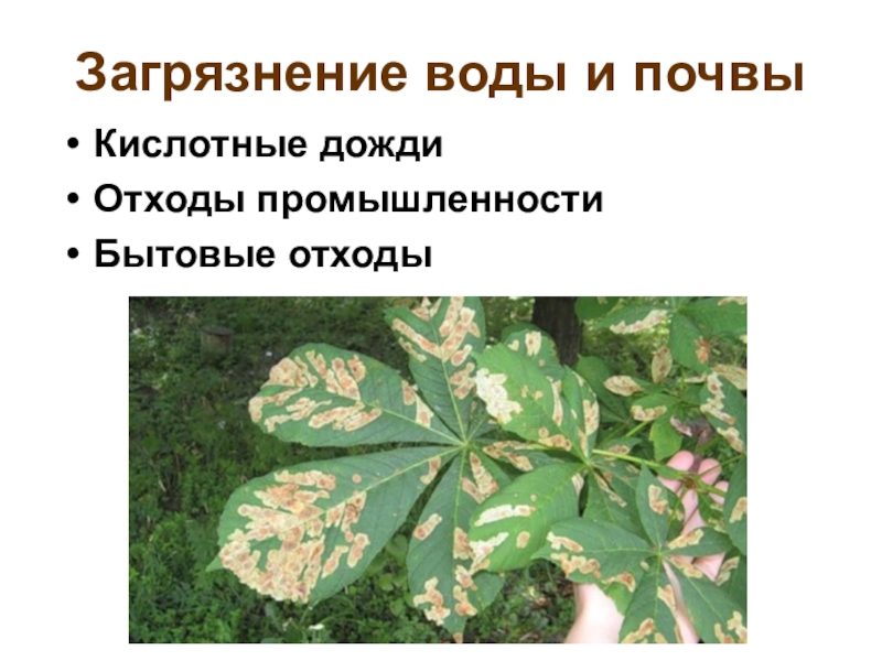 Загрязнение воды и почвыКислотные дождиОтходы промышленностиБытовые отходы