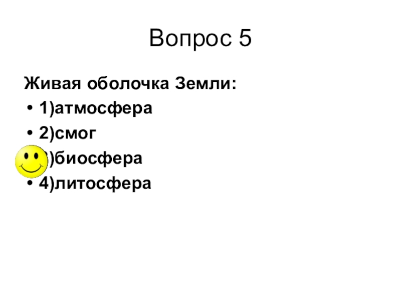 Вопрос 5Живая оболочка Земли:1)атмосфера 2)смог 3)биосфера 4)литосфера