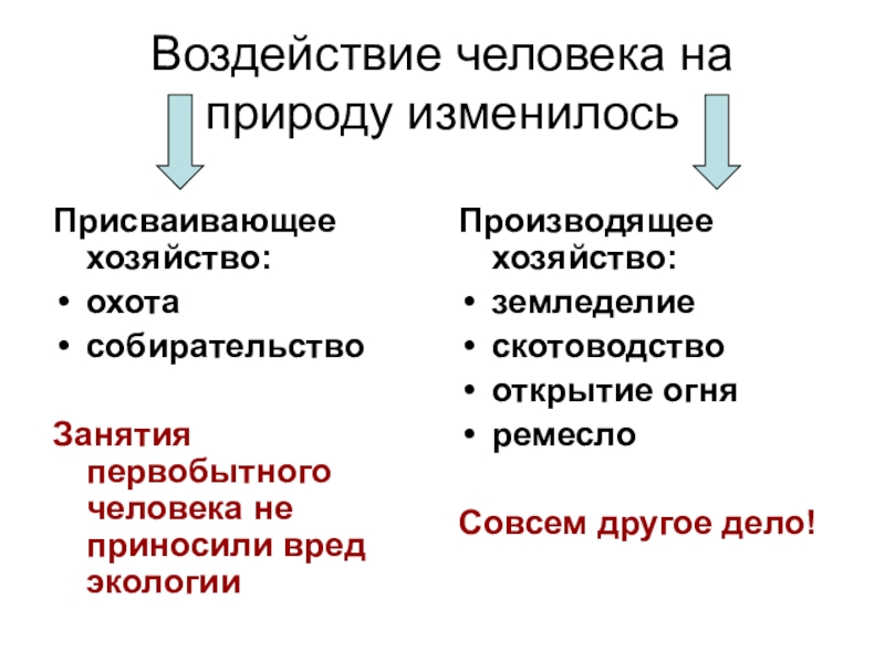 Воздействие человека на природу изменилосьПрисваивающее хозяйство: охотасобирательствоЗанятия первобытного человека не приносили вред экологииПроизводящее хозяйство:земледелиескотоводство открытие огняремеслоСовсем другое
