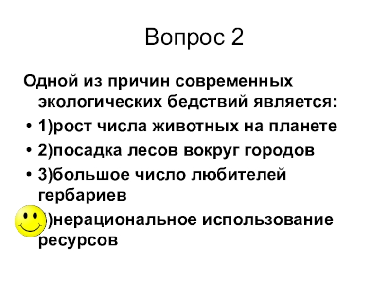 Вопрос 2Одной из причин современных экологических бедствий является:1)рост числа животных на планете2)посадка лесов вокруг городов3)большое число любителей
