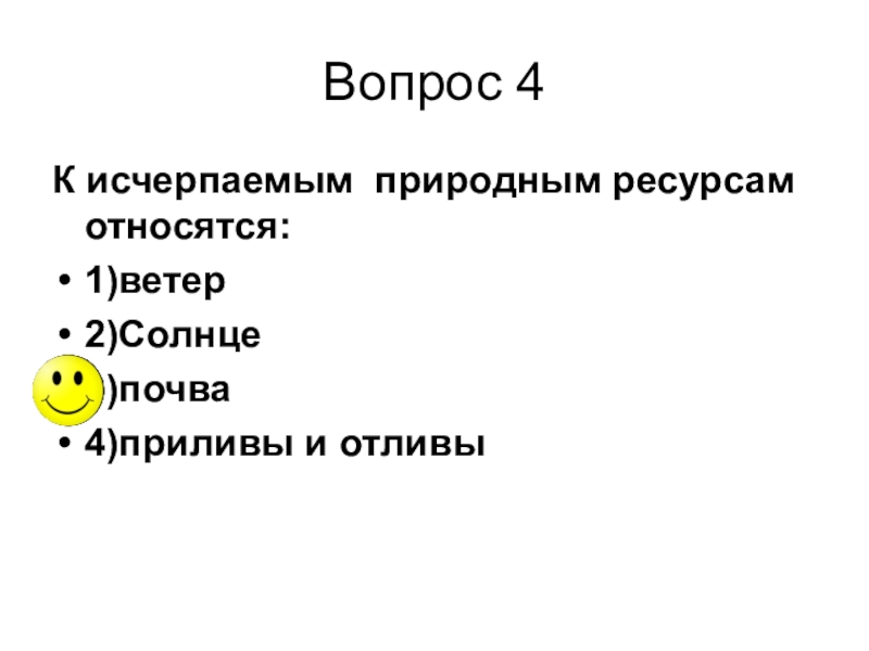 Вопрос 4К исчерпаемым природным ресурсам относятся:1)ветер 2)Солнце 3)почва  4)приливы и отливы