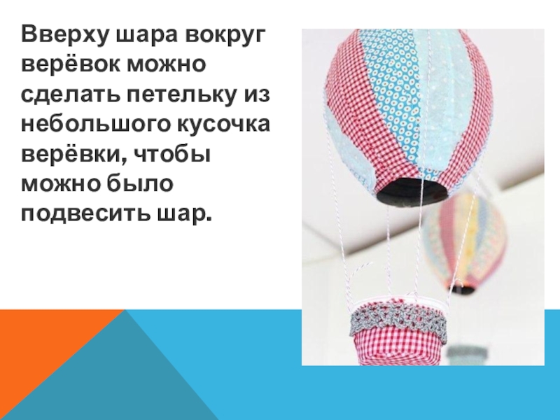Слайд 11Вверху шара вокруг верёвок можно сделать петельку из небольшого кусочка