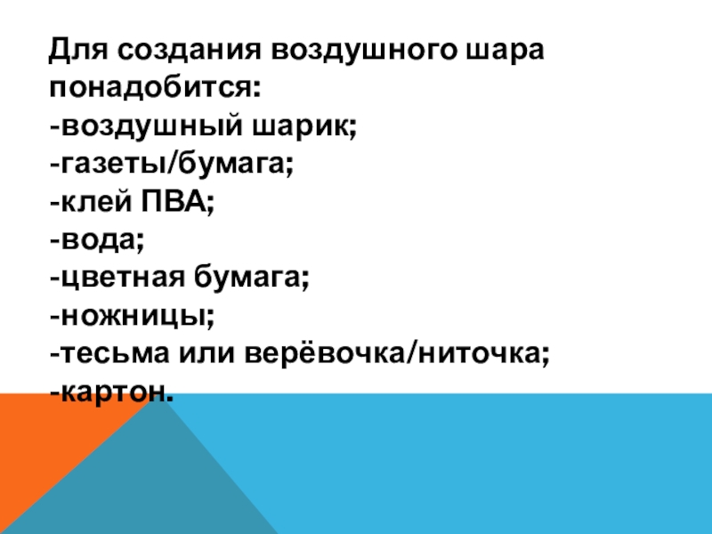 Слайд 3Для создания воздушного шара понадобится: -воздушный шарик; -газеты/бумага; -клей ПВА; -вода; -цветная бумага; -ножницы; -тесьма или верёвочка/ниточка; -картон.