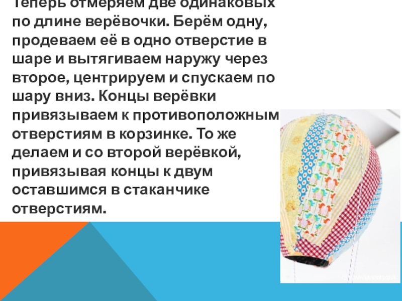 Слайд 10Теперь отмеряем две одинаковых по длине верёвочки. Берём одну, продеваем
