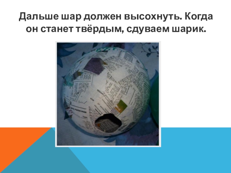 Слайд 7Дальше шар должен высохнуть. Когда он станет твёрдым, сдуваем шарик.