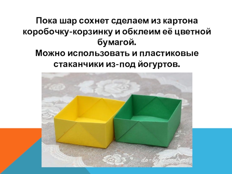 Слайд 8Пока шар сохнет сделаем из картона коробочку-корзинку и обклеим её