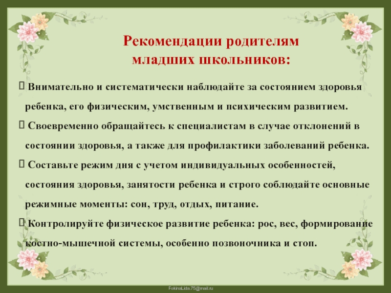 Рекомендации родителям младших школьников: Внимательно и систематически наблюдайте за состоянием здоровья ребенка, его физическим, умственным и психическим