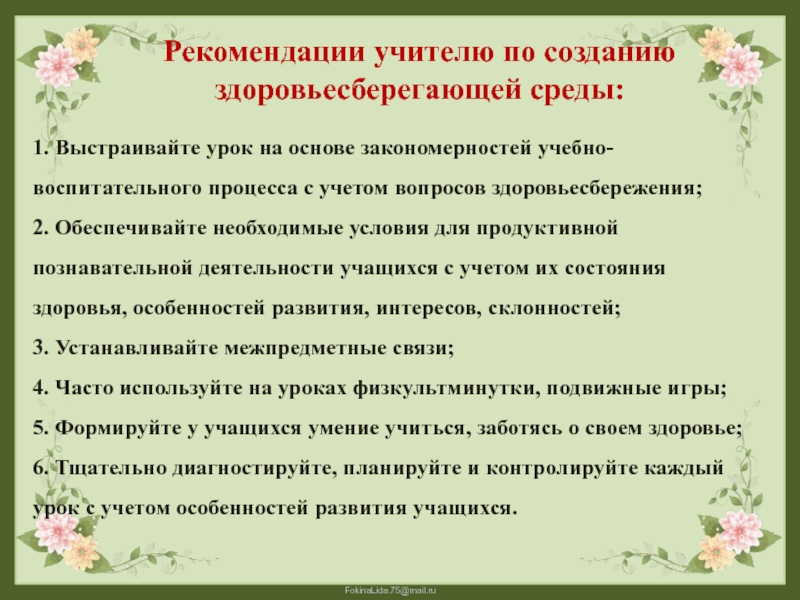 Рекомендации учителю по созданию здоровьесберегающей среды: 1. Выстраивайте урок на основе закономерностей учебно-воспитательного процесса с учетом вопросов