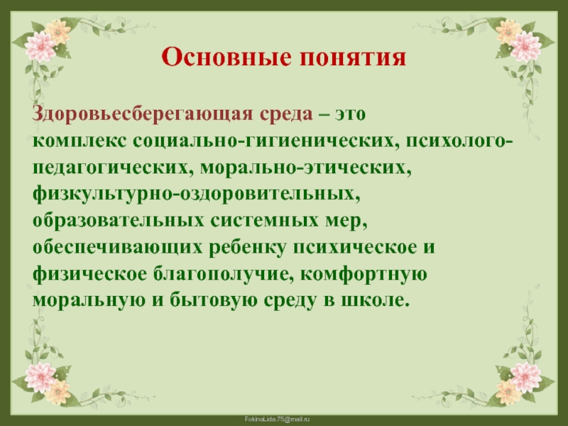 Основные понятияЗдоровьесберегающая среда – это комплекс социально-гигиенических, психолого-педагогических, морально-этических, физкультурно-оздоровительных, образовательных системных мер, обеспечивающих ребенку психическое и