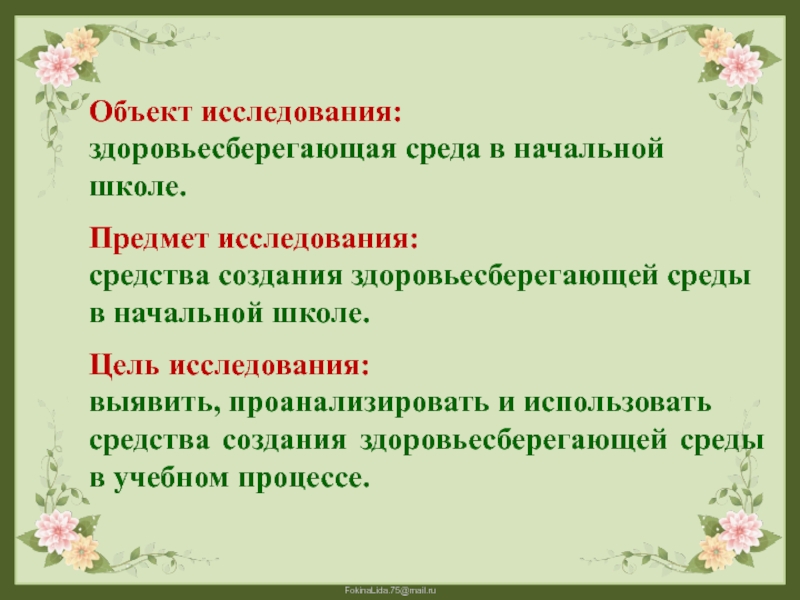 Объект исследования: здоровьесберегающая среда в начальной школе.Предмет исследования: средства создания здоровьесберегающей среды в начальной школе.Цель исследования: выявить,