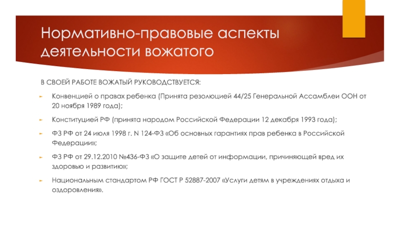 Слайд 5Нормативно-правовые аспекты деятельности вожатого