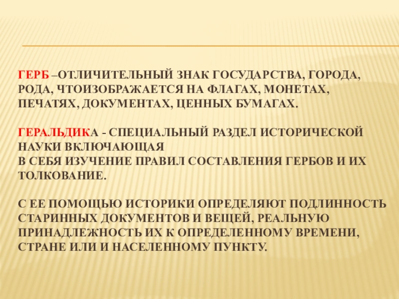 Герб –отличительный знак государства, города, рода, чтоизображается на флагах, монетах, печатях, документах, ценных бумагах.   Геральдика - специальный раздел исторической науки включающая в себя изучение правил составления гербов и их толкование.