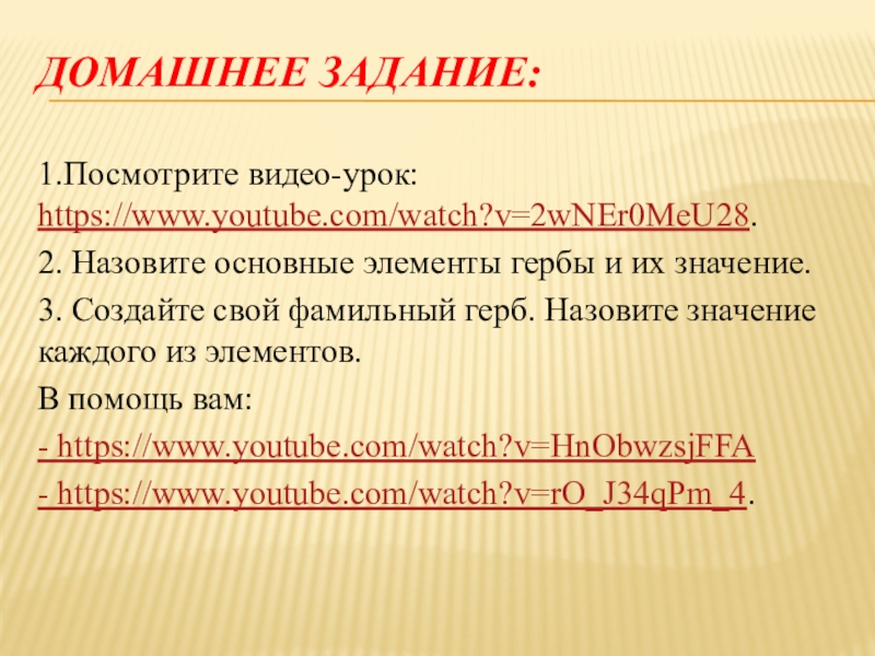 Домашнее задание:1.Посмотрите видео-урок: https://www.youtube.com/watch?v=2wNEr0MeU28.2. Назовите основные элементы гербы и их значение.3. Создайте свой фамильный герб. Назовите значение