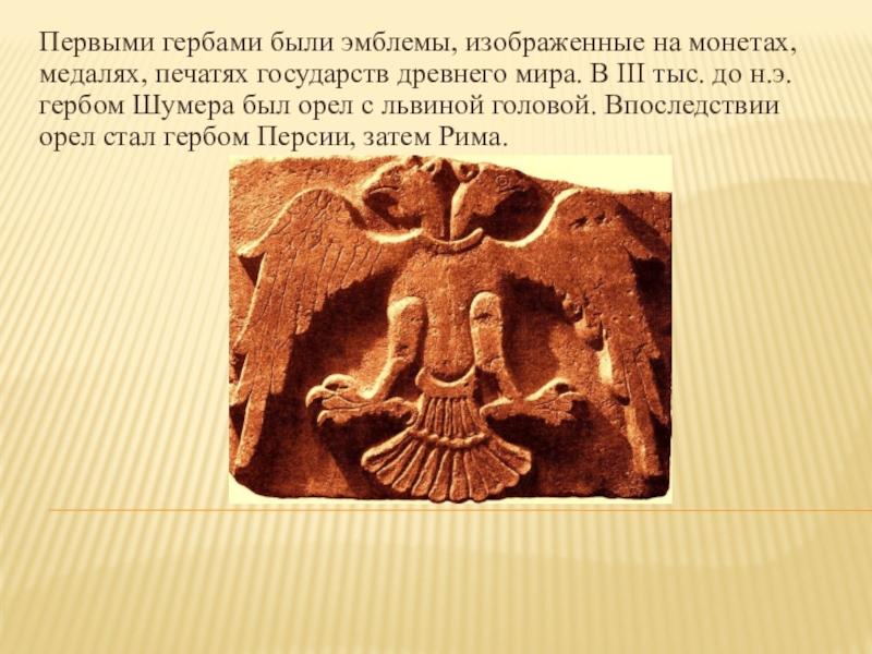 Первыми гербами были эмблемы, изображенные на монетах, медалях, печатях государств древнего мира. В III тыс. до н.э.