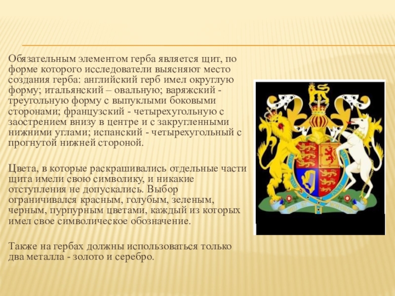 Обязательным элементом герба является щит, по форме которого исследователи выясняют место создания герба: английский герб имел округлую